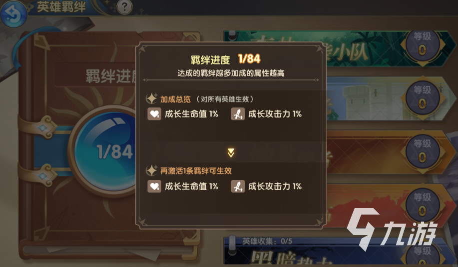 另外還有一個(gè)羈絆進(jìn)度的設(shè)定,這個(gè)進(jìn)度也是帶來屬性能力提升的。和對(duì)應(yīng)的羈絆不同的是,這個(gè)屬性是所有英雄都可以吃到加成的,加成的屬性是攻擊和生命的百分比,激活的羈絆越多,進(jìn)度提升也就越大。