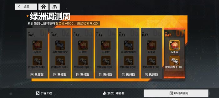 最近游戲的開服活動(dòng),大家只需要累計(jì)登錄7天就可以拿到20張檢索指令,目前暫時(shí)沒(méi)有說(shuō)這個(gè)活動(dòng)截至到哪一天,大概率持續(xù)一個(gè)月左右,畢竟是調(diào)測(cè)周這個(gè)主題,所以沒(méi)有登錄的小伙伴們可得抓緊機(jī)會(huì)。