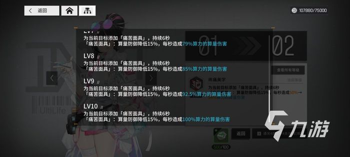主動技能為痛苦面具,cd只有6s時間,可以給敵人持續(xù)附加debuff,降低15%防御力,而且每秒額外收到50%算力的傷害,在面對高坦度的boss時,這個效果還是非常不錯的,搭配函數(shù)的減防效果,幾乎可以做到真實傷害的輸出。