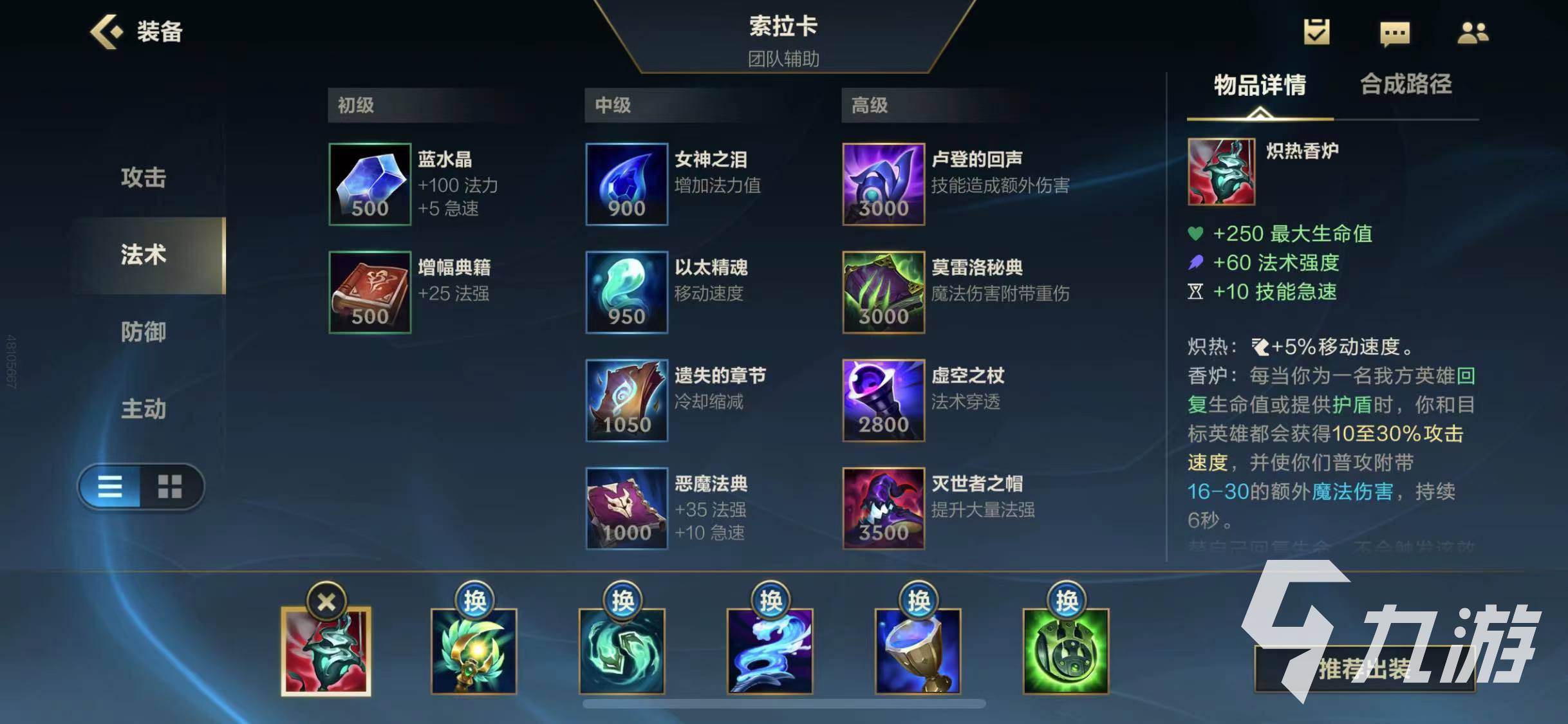 香爐這個(gè)裝備是索拉卡這種治療輔助的核心裝備,香爐能夠?yàn)樾』锇閭兲峁┧骼ㄖ委煹淖畲笊?,同時(shí)還有一定的法強(qiáng)加成,當(dāng)然還有技能的急速屬性,最關(guān)鍵的就是香爐的被動(dòng)了,裝備香爐的效果就是在治療隊(duì)友的時(shí)候,可以給隊(duì)友提供一個(gè)額外的護(hù)盾值,并且還能夠?yàn)殛?duì)友提供大量的攻速效果加成,讓隊(duì)友的普通攻擊能夠附帶高額的魔法傷害,只要索拉卡出了這個(gè)裝備以后,大家都可以大幅度的提升我方這邊的ADC傷害和續(xù)航。