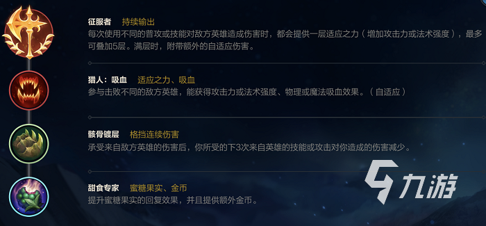 首先天賦一共有兩個(gè)選擇,第一個(gè)就是比較注重打團(tuán)傷害的征服者,主系征服者小天賦點(diǎn)出吸血、骸骨鍍層、甜食專(zhuān)家。首先征服者是非常適合亞索的一個(gè)天賦,超快的技能冷卻CD加上攻擊速度極快,讓亞索可以很輕松地在對(duì)線或者團(tuán)戰(zhàn)上打出征服者效果,且吸血、骸骨鍍層、甜食專(zhuān)家都是提升亞索對(duì)線能力的,總體來(lái)說(shuō)這是一套屬于攻守兼?zhèn)涞姆?,?duì)一些熟練度較高的玩家推薦使用。