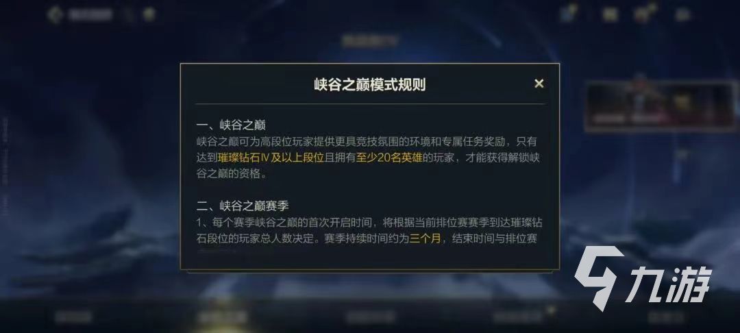 玩家想要獲得峽谷之巔資格參加峽谷之巔排位,有兩個前提條件,一是需要玩家的段位達到鉆石分段,第二個條件就是需要玩家擁有至少20個英雄。第二個條件很好理解,即便是普通排位也需要玩家有足夠的英雄,這樣防止玩家在想要玩的英雄被BAN掉沒有英雄可玩。滿足這個條件也非常簡單,只要玩家可以達到鉆石分段,購買20個英雄是沒有任何問題的。
