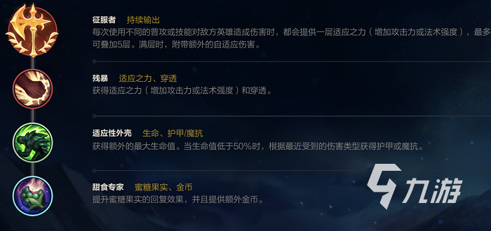 不管是選擇暴擊流還是一刀流,在符文上都是沒(méi)有根本改變的,全部都選擇主系征服者為主,剩下的小天賦點(diǎn)風(fēng)暴聚集、適應(yīng)性外殼、甜食專(zhuān)家,尤其是一刀流出裝一定要點(diǎn)甜食專(zhuān)家,對(duì)暴擊流來(lái)說(shuō)可以換成獵人,因?yàn)楫?dāng)飲血?jiǎng)Τ鰜?lái)之后就不需要果子了。