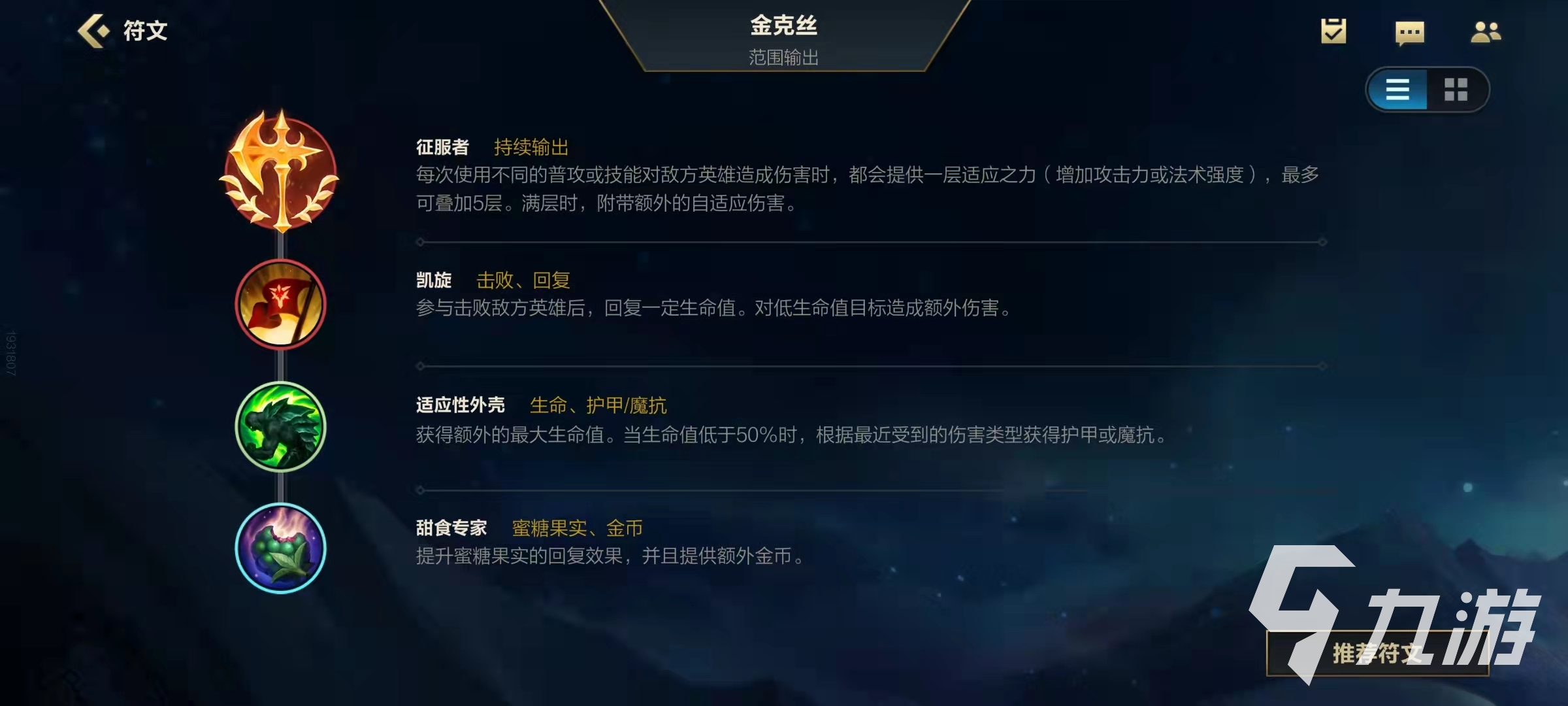 征服者只有金克斯在技能啟動(dòng)后才用得到,在被動(dòng)和征服者的加持下,金克斯的持續(xù)輸出能力驚人。凱旋非常契合金克斯的機(jī)制,技能啟動(dòng)還能回血,適應(yīng)性外殼提升金克斯的容錯(cuò)率,甜食專家讓金克斯更易賴線。