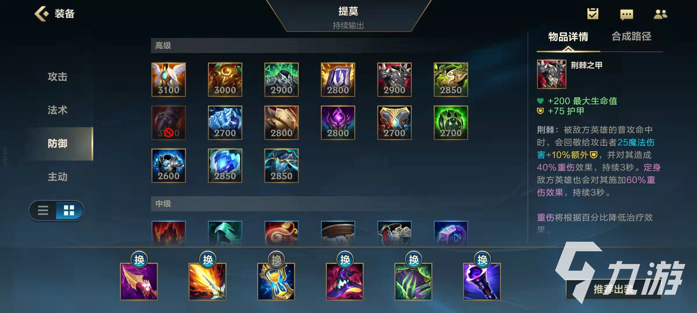 上單大多都是坦克或者半肉戰(zhàn)士,既然都少不了出肉裝,那么玩家第一次回家可以直接裸一個(gè)小反甲。小反甲不僅有高額的護(hù)甲加成,還能反彈對(duì)手一定的傷害同時(shí)對(duì)目標(biāo)造成重傷效果。玩家在出了護(hù)甲裝備后在選擇自己的核心裝備,一般有了護(hù)甲裝備更容易抗壓。后續(xù)裝備像蘭頓、布甲鞋都是收益很高的,坦克英雄克制直接護(hù)甲到底。