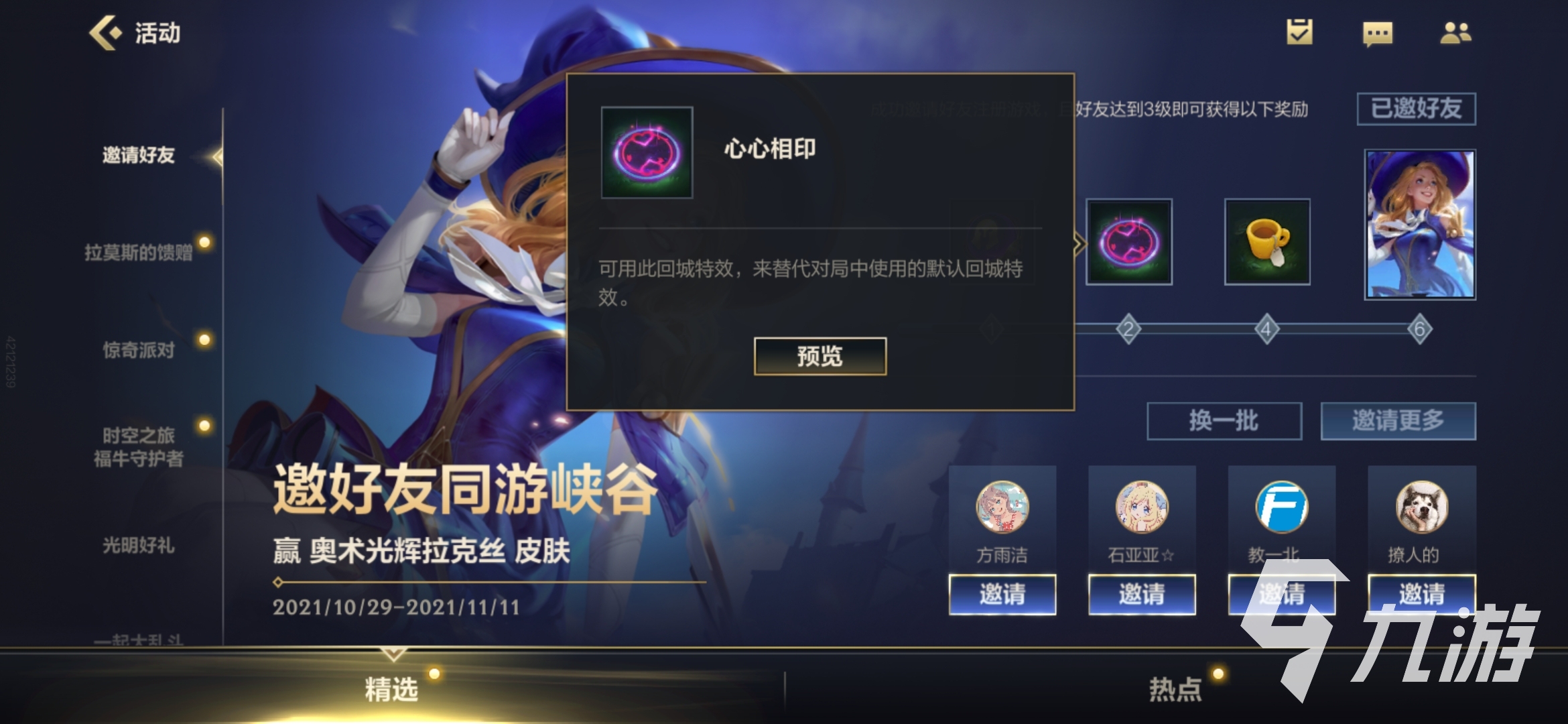 這次的活動獎勵還是非常豐富的,小伙伴們根據(jù)邀請人數(shù)的不同可以獲取到不同的獎勵,可以獲取的獎勵有英雄自選禮包,心心相印的回城特效,“真是個杯具”的印記效果,最后的獎勵就是拉克絲的奧數(shù)光輝皮膚了,小伙伴還是可以積極參與進來了,畢竟獎勵還是非常不錯的。
