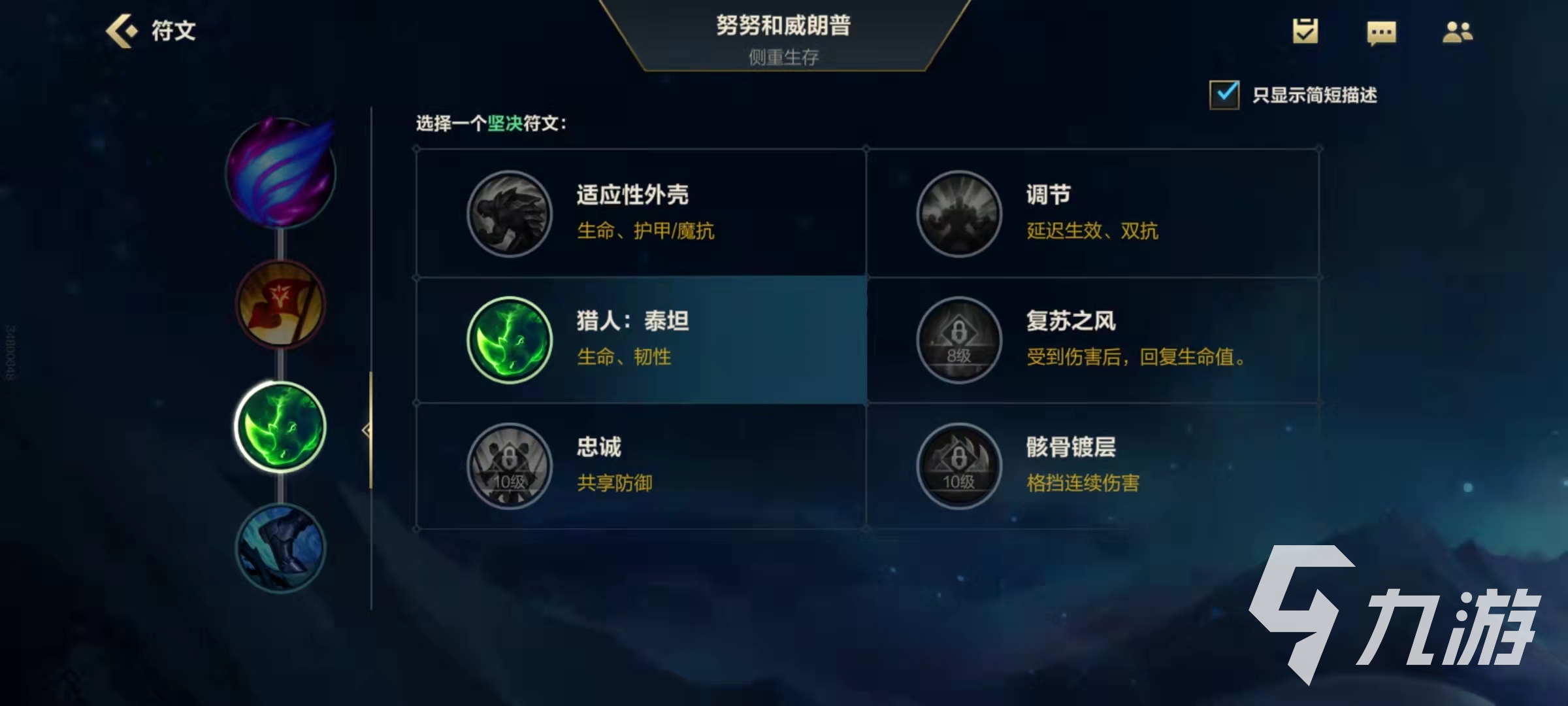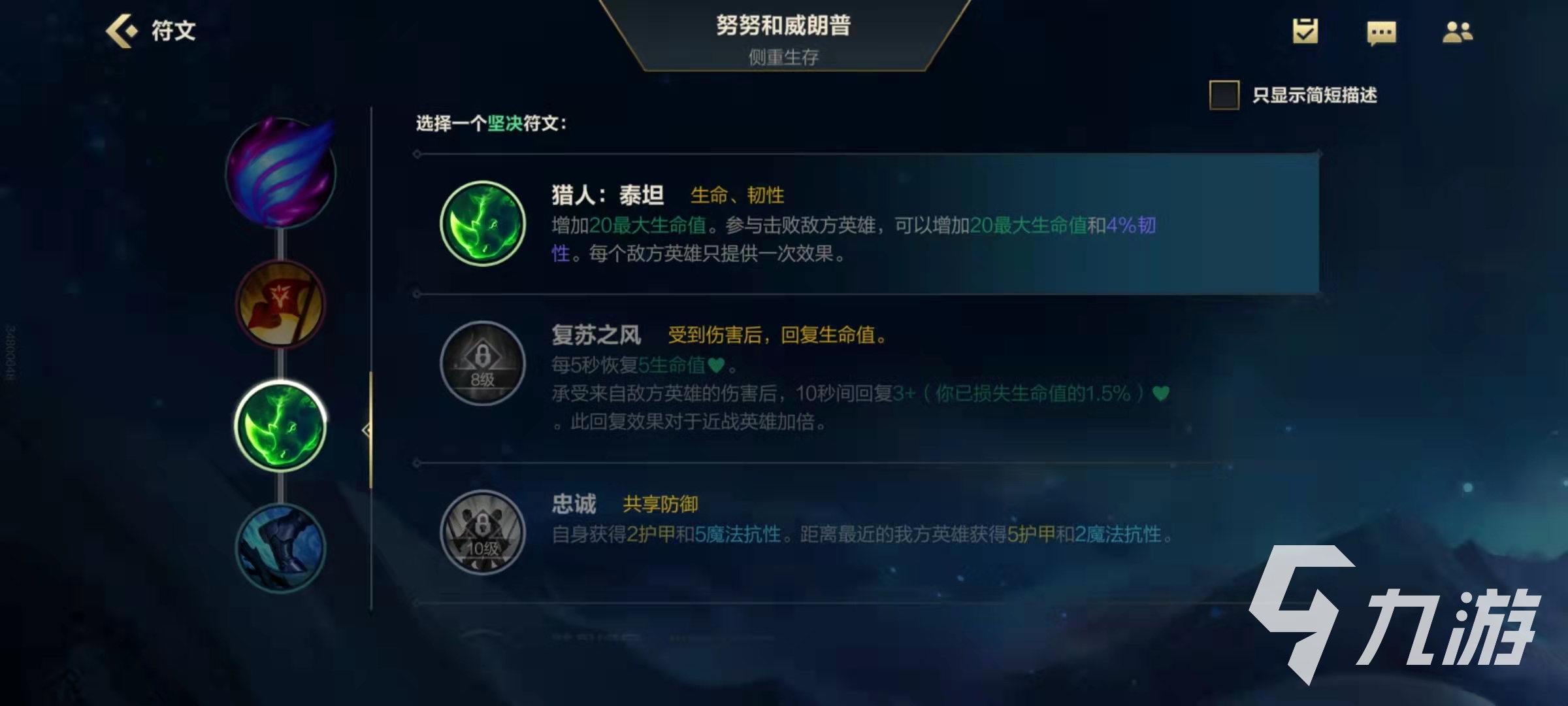 調(diào)節(jié)符文的效果是在戰(zhàn)斗開始五分鐘之后,才能獲得護(hù)甲和魔法抗性,之后的每兩分鐘就獲得一次成長,每次兩點護(hù)甲和魔抗。這個符文適合純?nèi)饣蚴前肴馔娣ǖ挠⑿?,射手和法師就不要出了,越是拖到后期就越有利。不適合前期需要去抓野區(qū)和游走的玩家使用。獵人-泰坦符文增加的是生命值和韌性,在擊敗了對方英雄之后,可以獲得額外的生命值和韌性加成,如果是擊殺了五名敵方英雄,那么就可以多出百分之二十的韌性。韌性越高被控制的時間就越短,這個符文適合經(jīng)常去單殺對方但是怕控制的英雄,例如劍圣,卡茲克,皎月等。