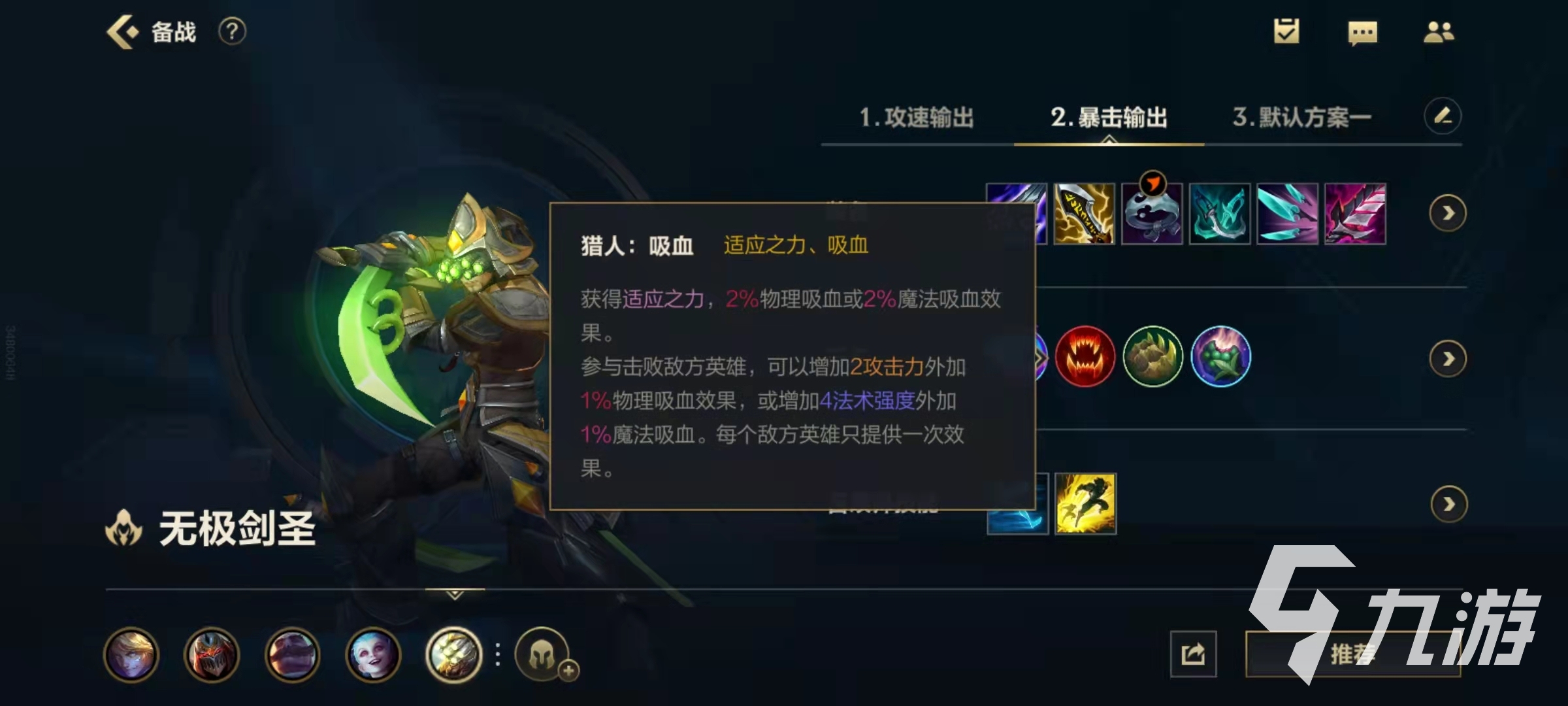 獵人:吸血的效果是增加百分之二的物理吸血或是魔法吸血效果,同時(shí)當(dāng)擊敗敵方英雄之后,可以額外增加二點(diǎn)攻擊力和百分之一的吸血效果,每個(gè)敵方英雄只能一次效果。也就是說(shuō)將對(duì)方五名英雄都?xì)⒁槐?,增加到最后就是總?jì)百分之七的吸血,和十點(diǎn)的攻擊力。這個(gè)效果就比較明顯了,一些刺客英雄或是游走型的英雄可以使用。尤其是走游走的劍圣,本來(lái)人頭就很多,這樣很快就能將效果疊加起來(lái)。