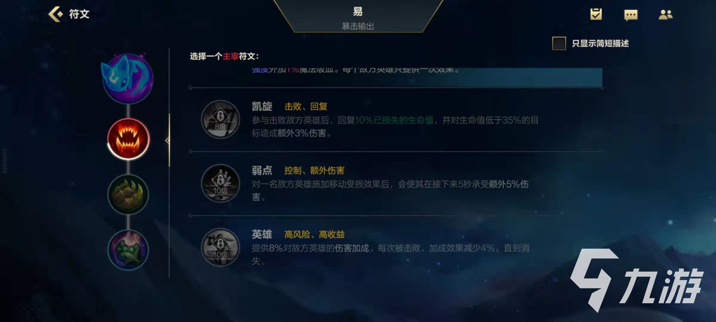 凱旋的效果是擊敗敵方英雄恢復(fù)生命值,這個(gè)符文很適合一些本來(lái)就具有擊敗效果的英雄,例如金克絲就非常合適,金克絲擊殺之后增加速度,現(xiàn)在又有了生命值加成,持續(xù)戰(zhàn)斗能力和追殺能力就更強(qiáng)悍了。弱點(diǎn)的效果是對(duì)敵方英雄施加減速效果之后,可以使得目標(biāo)在五秒之內(nèi)獲得百分之五的易傷效果,但是因?yàn)閿?shù)值太小,所以使用的也不多,一些具有減速技能的英雄可以考慮。例如布隆這樣的英雄,本來(lái)就是輔助效果,現(xiàn)在相當(dāng)于多了一個(gè)傷害加成技能,也算是對(duì)射手的一些福利。英雄符文的效果是提供初始就提供百分之八對(duì)敵方英雄的傷害,但是被擊敗就會(huì)減少效果,初始效果非常好,但是風(fēng)險(xiǎn)高,除了一些速推陣容外,不建議選擇。但是一些喜歡去對(duì)方的野區(qū)抓野的玩家比較合適,因?yàn)槎?jí)甚至是一級(jí)就去入侵野區(qū),其他的符文效果都還沒(méi)發(fā)揮出來(lái),英雄符文自然就是能帶來(lái)很大的勝算,同理一些一級(jí)就帶著機(jī)器人去游走的也可以選擇。