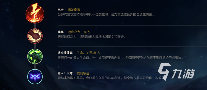 符文有兩套推薦,第一套就是電刑為主系的爆發(fā)流,因?yàn)轲ㄔ翾EW可以輕松打出電刑傷害,所以以爆發(fā)流為主肯定要點(diǎn)出電刑。其次第二行可以點(diǎn)殘暴來增加英雄的法術(shù)穿透,但因?yàn)轲ㄔ率且粋€(gè)進(jìn)場類型英雄,所以第三行可以點(diǎn)出適應(yīng)性外殼來避免被秒殺,不過等到了大后期有金身附魔可以規(guī)避。最后一行肯定要點(diǎn)出技能CD,因?yàn)轲ㄔ逻@個(gè)英雄的大招CD很長,一定要點(diǎn)出獵人CD。