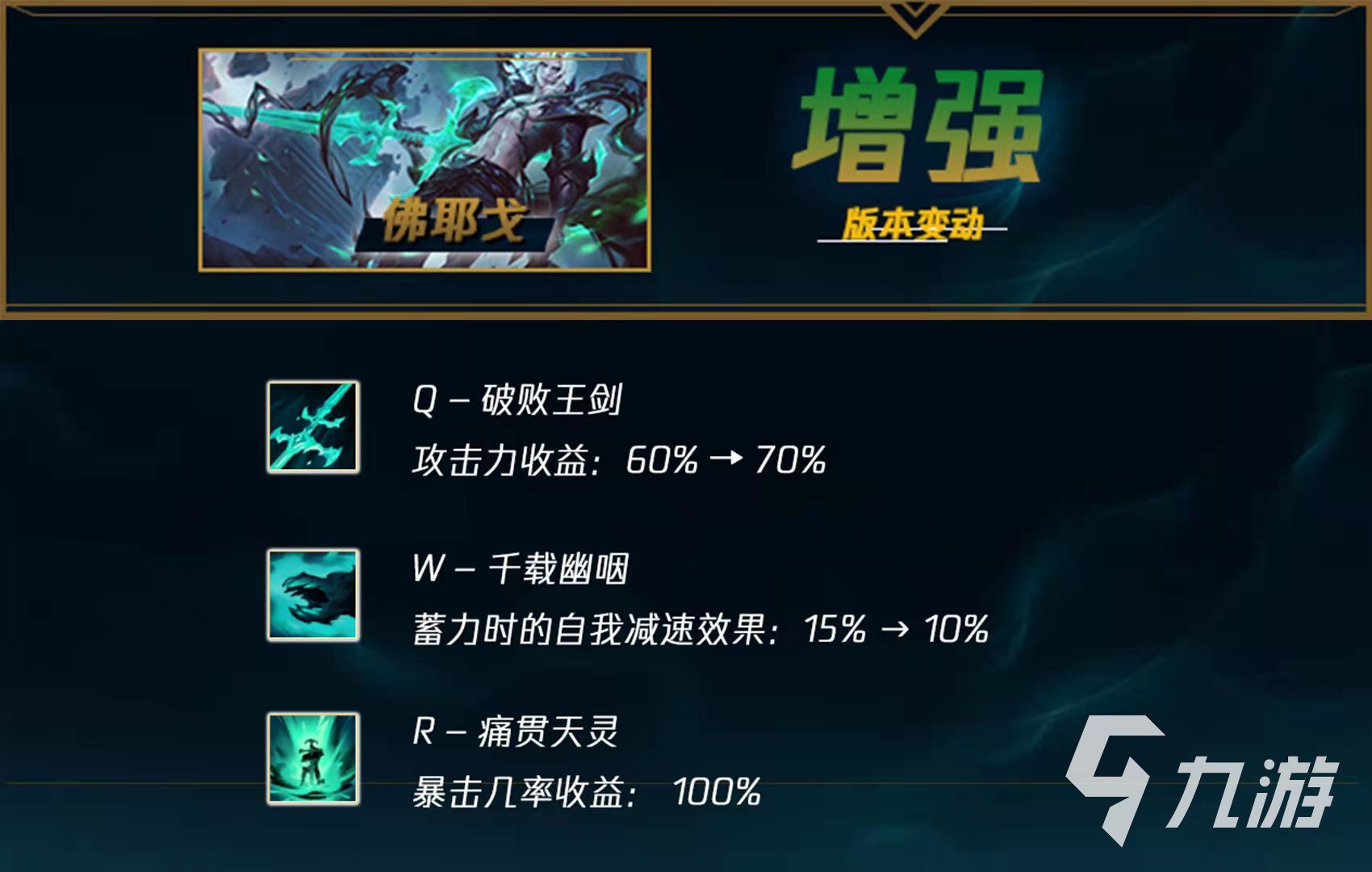 佛耶戈的Q技能攻擊力收益提升,W技能的減速降低,大招的暴擊幾率收益提升至100%。