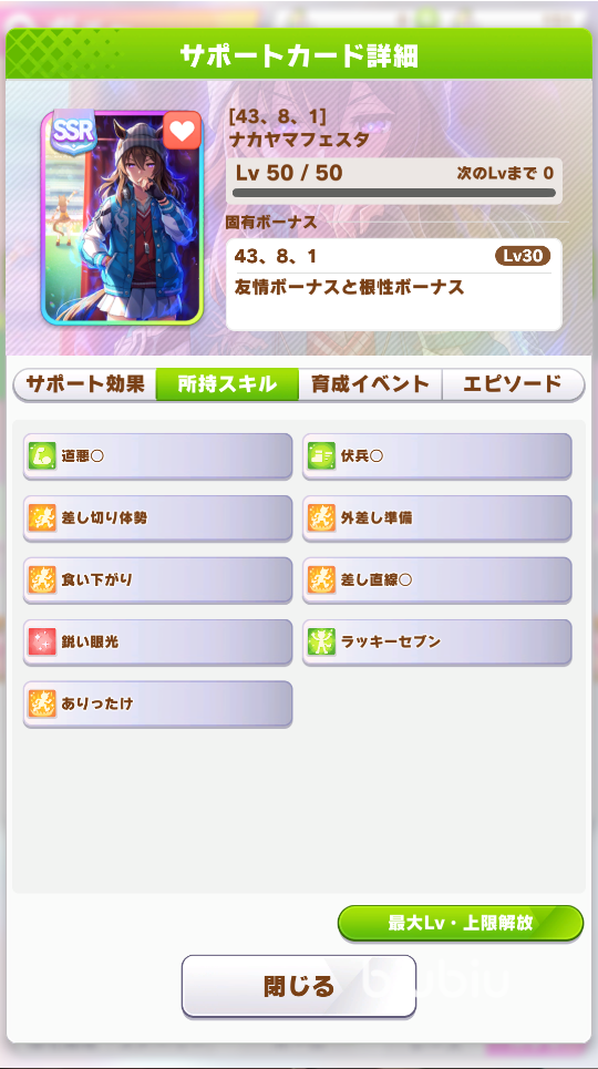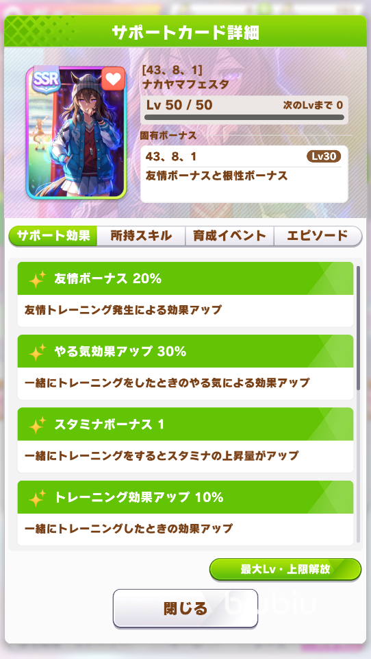 此外,中山慶典支援卡的高得意率也是它的另一個(gè)優(yōu)勢(shì),在滿級(jí)滿破后該支援卡有著50的得意率,與北部玄駒不相上下。高得意率使得這張SSR支援卡在實(shí)際培育過(guò)程中可以多次觸發(fā)彩圈,并且提高最后的評(píng)價(jià)。
