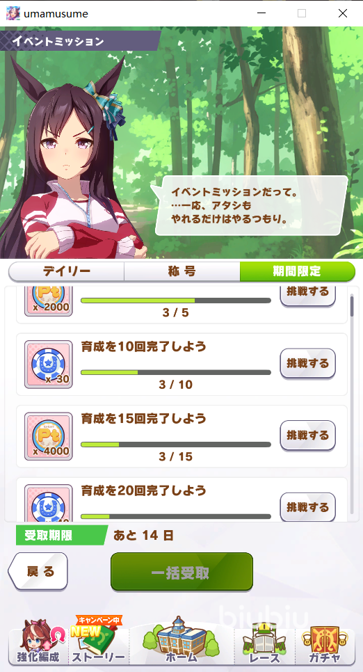 樂(lè)鳴晚秋活動(dòng)的限定任務(wù)同樣可以為我們帶來(lái)非常豐厚的PT點(diǎn)數(shù)獎(jiǎng)勵(lì),不過(guò)這些任務(wù)有一個(gè)非常麻煩的地方,那就是它們都是日文,很多小伙本可能會(huì)因?yàn)檎Z(yǔ)言不通的原因看不懂。不過(guò)不用擔(dān)心,根據(jù)小編的測(cè)試來(lái)看這些任務(wù)大部分都是累計(jì)型任務(wù),只要培育次數(shù)夠多就可以自動(dòng)完成。