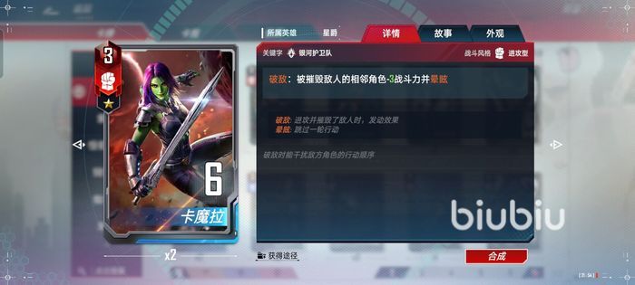 首先是卡魔拉,卡魔拉這張卡在整個(gè)卡組當(dāng)中算是非常前期的一張卡了。她唯一的作用就是在開(kāi)局的兩個(gè)回合之內(nèi),擊垮敵方的陣容,延長(zhǎng)敵方陣容成型的時(shí)機(jī)。而且他的操作也非常簡(jiǎn)單,只需要觸發(fā)這張卡自帶的破敵,就可以對(duì)敵方造成高額的輸出。