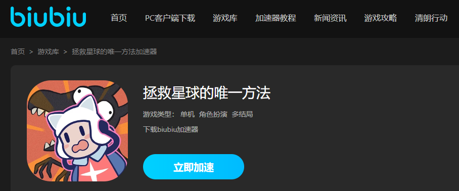 首先大家需要去biubiu的官網(wǎng)來搜索下載加速器,在下載完成以后,就可以直接打開這個加速器了,并且在app的首頁搜索框之中搜索拯救星球的唯一方法。