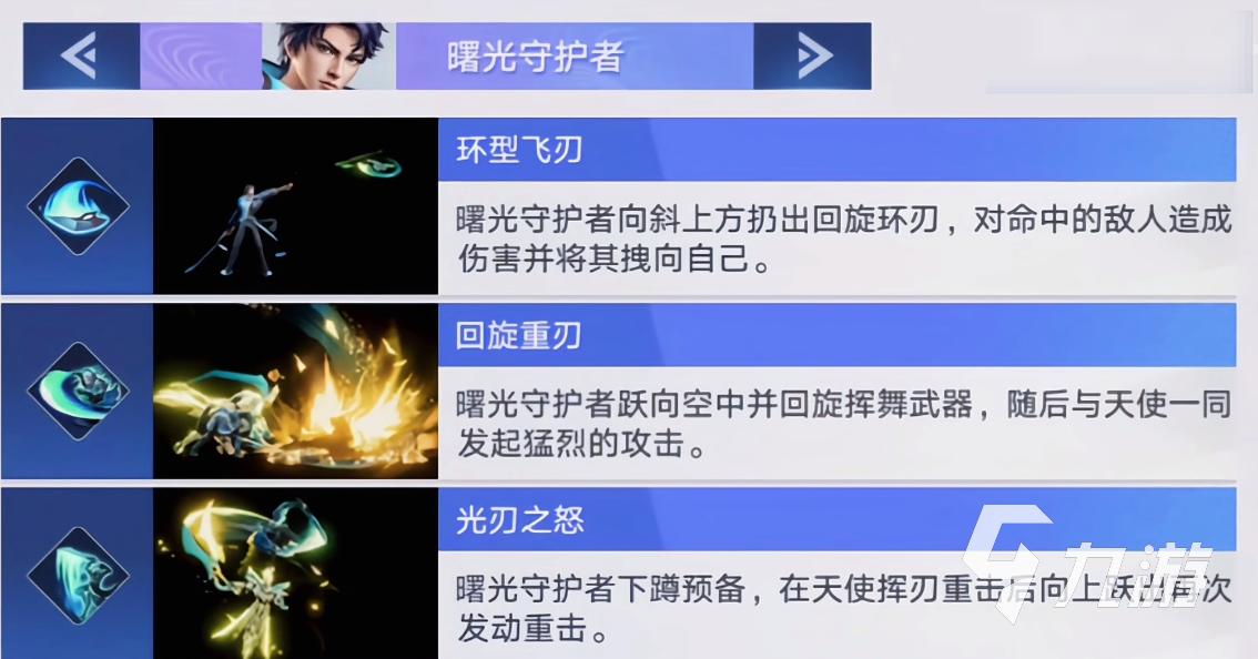 技能二【回旋重刃】:這個(gè)技能是鎧的躍起技能,可以在對(duì)戰(zhàn)中躍向空中并持續(xù)回旋揮動(dòng)武器,然后是和天使一起向敵方發(fā)起猛攻。這個(gè)技能是曙光守護(hù)者鎧的核心技能。