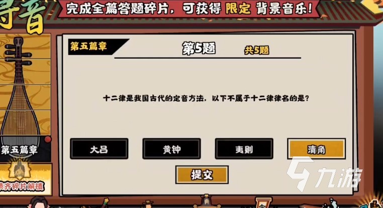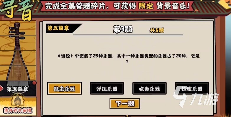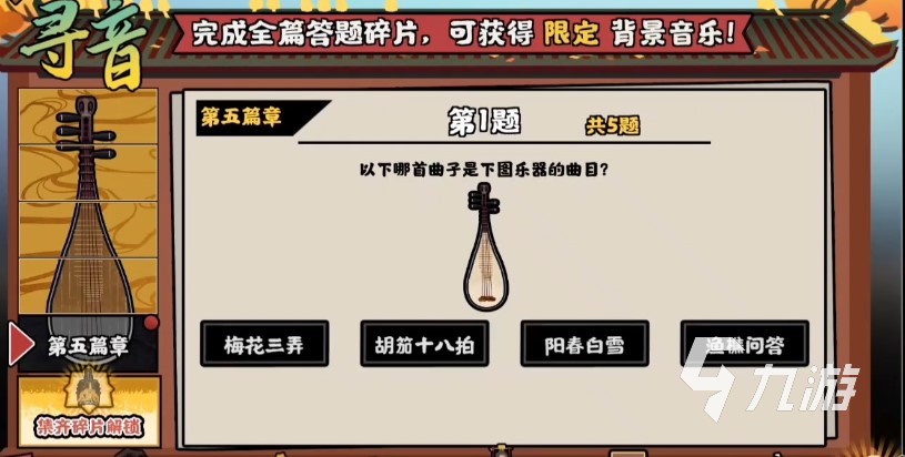 第五篇章-第一題、屏幕中會給出一個琵琶樂器,并讓玩家們猜出下列那首曲子出自琵琶樂器。