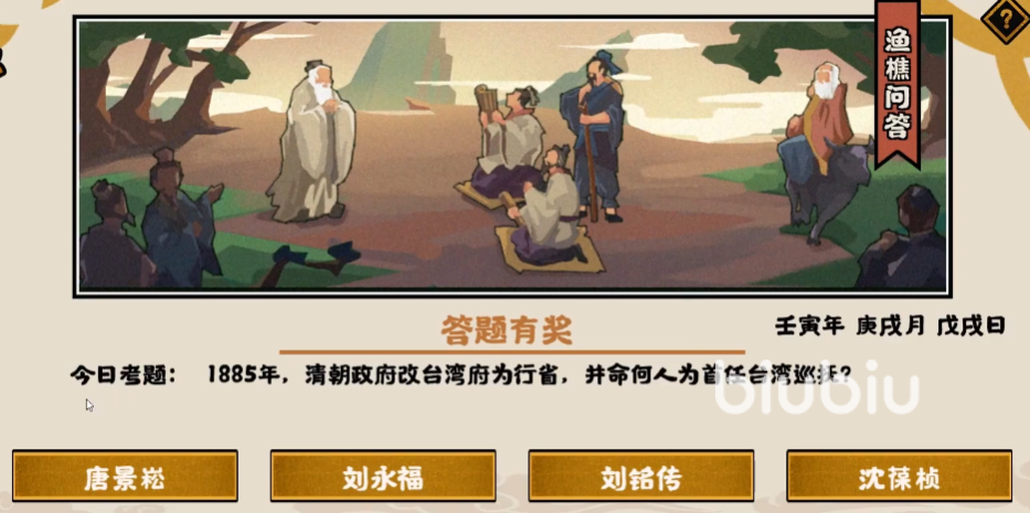 今日要作答的題目是:在一八八五年的時(shí)候,清政府將臺(tái)灣府改為行省,當(dāng)時(shí)是讓誰前去擔(dān)任臺(tái)灣首位巡撫的?
