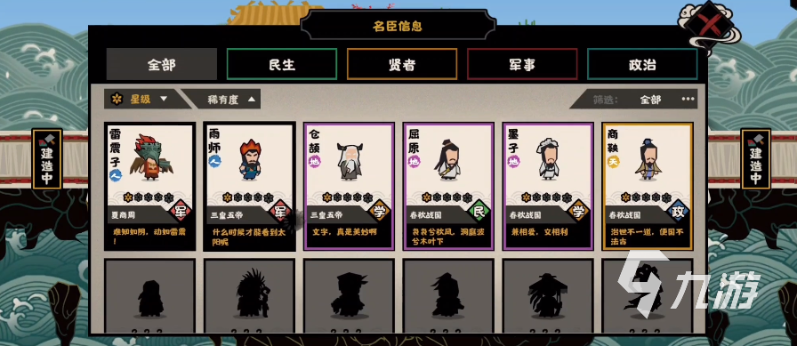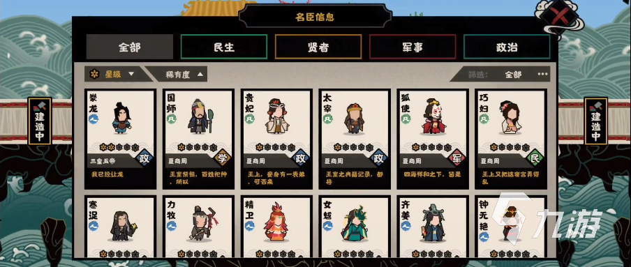 游戲中名臣有很多,這些名臣的實力差距很大。名臣獲取途徑很多,贈送名臣在朝代開局時。招攬是獲得名臣的另一種途徑。通過隨機觸發(fā)招攬,玩家通過一定概率,完成名臣的招攬。演化是獲取名臣的途徑之一。演化功能在山海世界的右下角,玩家通過抽卡的十連抽和單抽,從而獲得名臣。