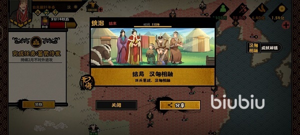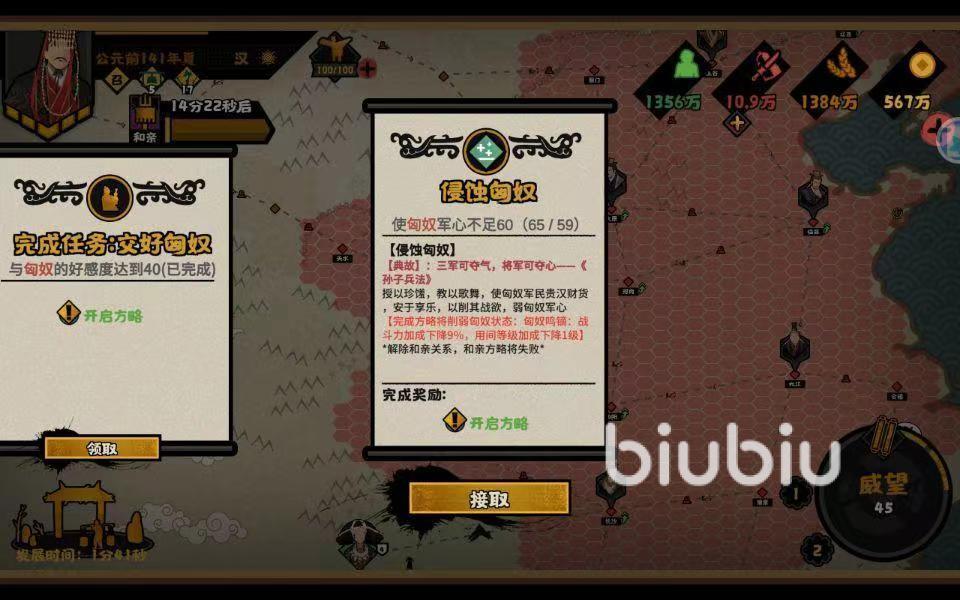往后是收集絲綢、民為邦本、順應(yīng)民心,弱其戰(zhàn)意、維系匈奴,到這一步要將匈奴的好感度提高到70。接下來(lái)是興建樓臺(tái),維系匈奴,糜其軍心,將匈奴的軍心下降到30以下。然后是擅政養(yǎng)民,擴(kuò)建工程,受命于天和蓄勢(shì)待發(fā),這些全部完成后,漢匈相融結(jié)局達(dá)成。