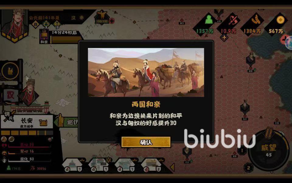 開局后最重要的事情就是完成和親,這將是最關(guān)鍵的方略,但是要想達(dá)到和親的條件,需要我方軍心低于50。為了盡快達(dá)到這一點(diǎn),建議攜帶一些減軍心的名臣或者是通過(guò)急行軍等方式降低軍心。等到匈奴來(lái)要求和親的時(shí)候,直接點(diǎn)擊同意增加好感度,和親后兩國(guó)會(huì)進(jìn)入到和平狀態(tài)。提升了好感度之后接下來(lái)就要完成交好匈奴,與匈奴的好感度達(dá)到40就可以了。