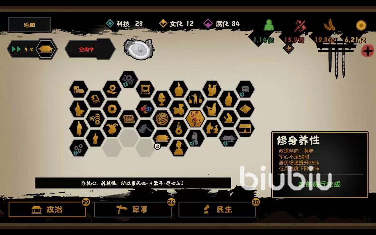 下一步的流程是侵蝕匈奴,將匈奴的軍心降到60以下,王昭君就可以很好的達(dá)到這一目的。接下來(lái)需要完成的政策是修身養(yǎng)性,加固國(guó)都,穩(wěn)固民心,繼續(xù)侵蝕匈奴,此時(shí)需要將匈奴的軍心降低到50以下。