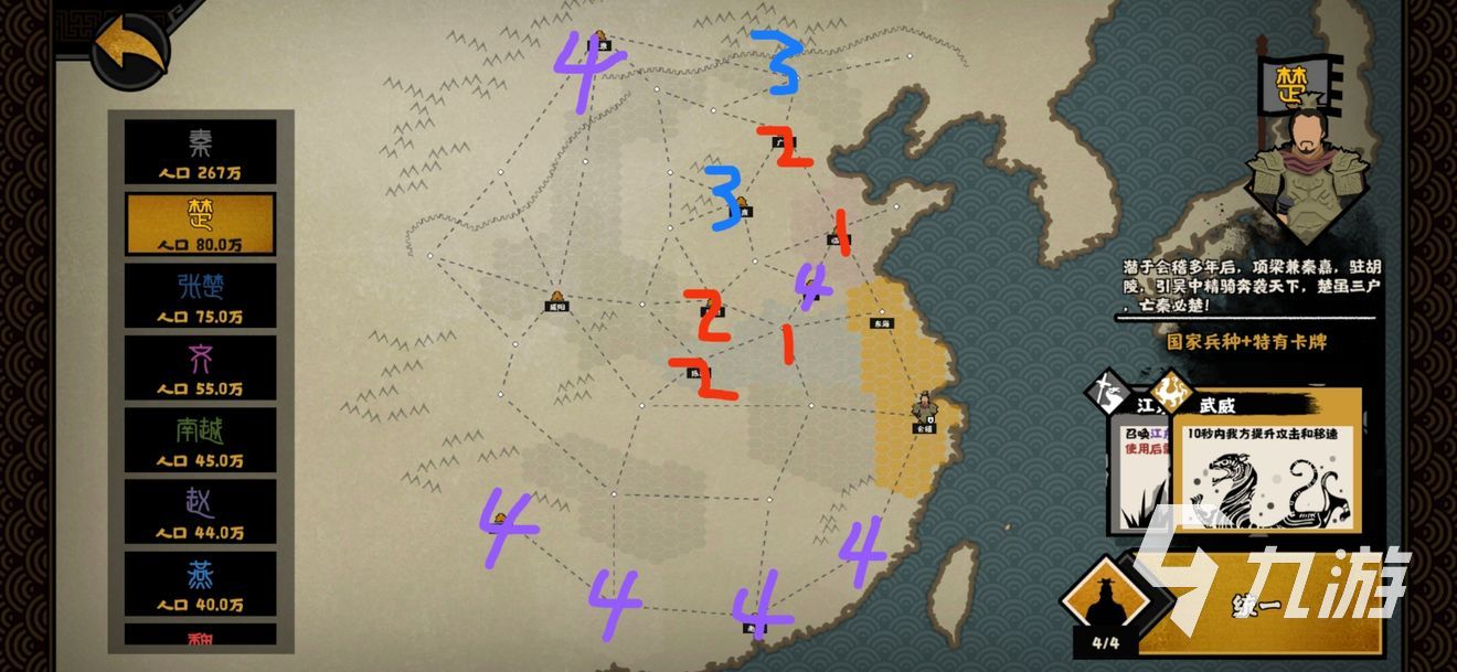 隨后北上-燕,西-魏-張楚,如果魏有5槍兵出現(xiàn),那么魏可以等等再打。滅掉這3個國家之后,有5馬和5匠,這時候可以升1階的騎兵以及狐貍的魅惑了。然后滅趙,能盡快打到匈奴,不給他主動的時間。