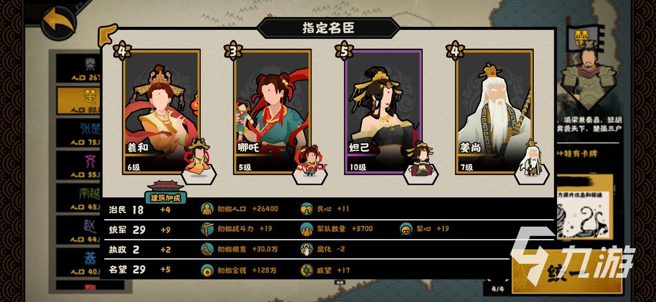 民生選擇羲和,沒啥可替的,沒有的話去前面三皇的劇本刷。政治用狐貍,主要是她的魅惑很好用,能夠跨級別打,而且也不用考慮怎么降低腐敗。此外,狐貍獲得威望很快,所以用來刷會盟、賢臣之類的好感是是很有用的。賢臣選擇姜子牙,很好用的,民心所向。最后軍事,有什么就用什么吧,比如白起孫武。