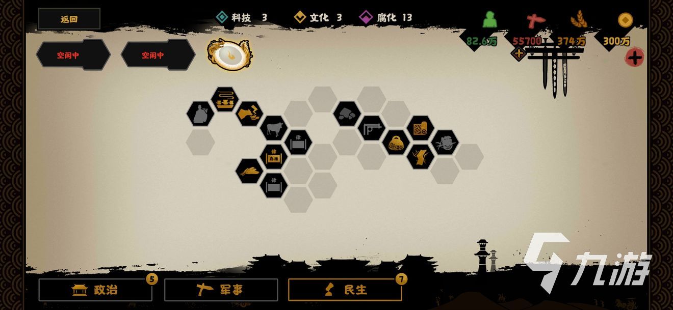 前文說過了,選楚,騎兵和技能好用,位置上也不錯,政策方面還有加戰(zhàn)力的。如果被克制了,簡單手動操作一下也就過了。不論其他國家怎么提升戰(zhàn)力,我們專心提升自己。只要是30分鐘以內(nèi)的不用自選的那些與政治、民生相關(guān)的政策都以點,軍事先不慌。特殊的資源保留馬、鐵、工匠。研究選羲和的1和姜子牙的2。先需要資源才能升的建筑不升,等后面再說。