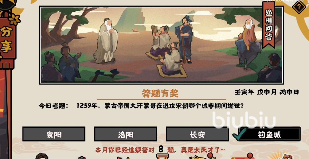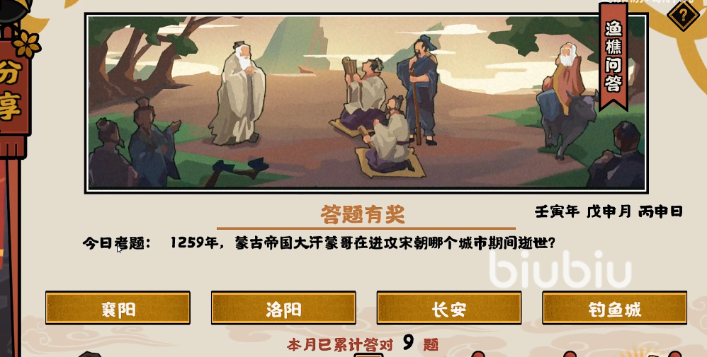 今天的考題內(nèi)容是:1259年,蒙古帝國大汗蒙哥在進(jìn)攻宋朝哪個城市期間逝世?