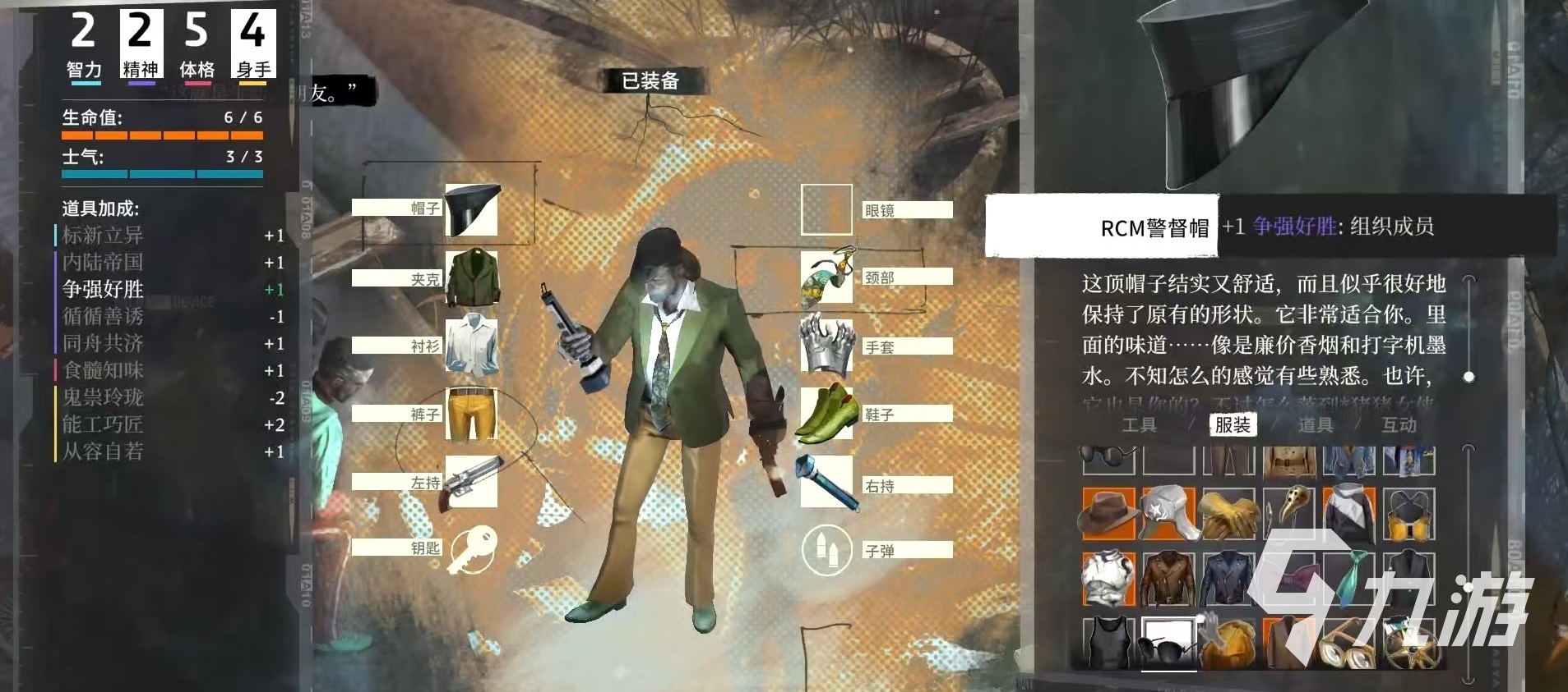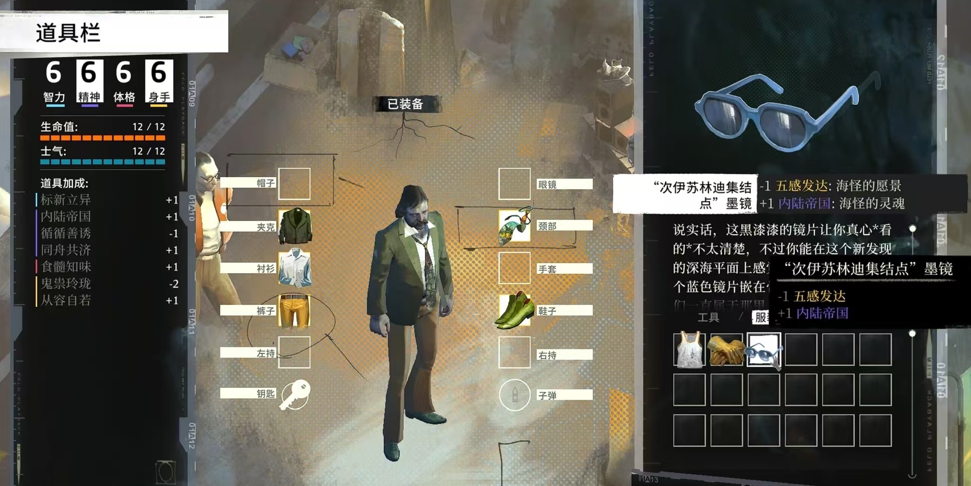然后看一下眼鏡,“次伊蘇林迪集結(jié)點”墨鏡,減少1點五感發(fā)達(dá),增加1點內(nèi)陸帝國,在席勒處獲得。同樣在席勒這里還可以得到自殺墨鏡,食髓知味增加1點,邏輯思維降低1點。大四眼處方眼鏡,廢棄的魚市處獲得,博學(xué)多聞增加2點,五感發(fā)達(dá)降低1點。翻蓋眼鏡“審計者”,岬岸公寓處得到,邏輯思維增加1點,爭強(qiáng)好勝減少1點。加姆洛克騎警太陽鏡,通情達(dá)理增加1點,邏輯思維減少1點。優(yōu)雅的辦公墨鏡,見微知著增加1點,故弄玄虛減少1點,在港口秘書處得到。