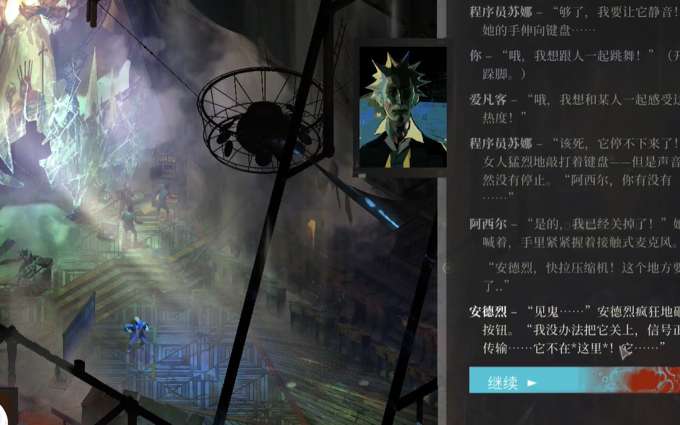 然后從這個房間走出去到外面,看到一個電玩房間,走進房間以后會看到整個房間除了破舊的電玩裝置,還有一個類似女性的npc一直在玩著電玩機,玩家們需要跟其對話,這時候npc會胡言亂語,玩家們只能通過去附近檢查電玩機的設備,通過這些設備再次詢問npc才能獲得下一步的線索。