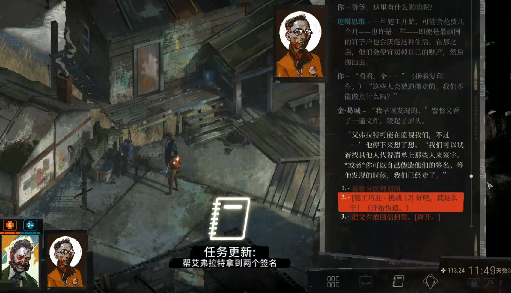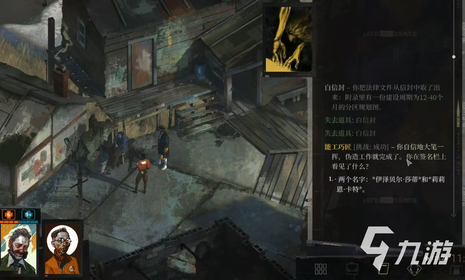 第2個(gè)簽名需要找到洗衣女工伊澤貝爾,她的要求是先拿到莉莉恩的簽名后才肯簽字,所以大家盡量先完成第1個(gè)簽名再去找她。如果直接去找伊澤貝爾簽名,需要通過循循善誘-14的檢定,才能夠說服她簽署文件,而且在檢定過程中金需要在隊(duì)伍中。當(dāng)然還有一種方式是可以選擇偽造簽名,但需要在室內(nèi)等比較隱蔽的地方進(jìn)行。還有一個(gè)選項(xiàng)是將白信封交給附近的流浪漢,讓他代簽第2個(gè)簽名也是可以的。