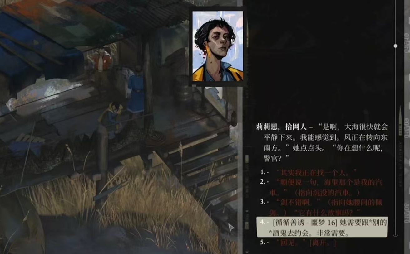 第3個是與莉莉恩約會的任務,玩家在漁村和莉莉恩有一場約會,在對話過程中可以選擇進行循循善誘-15的檢定。選擇我在海灘上發(fā)現一個風景很好的地方,這里指的就是地之角,然后前往地之角完成見面任務。完成之后可以獲得標準115毫米軍刀。