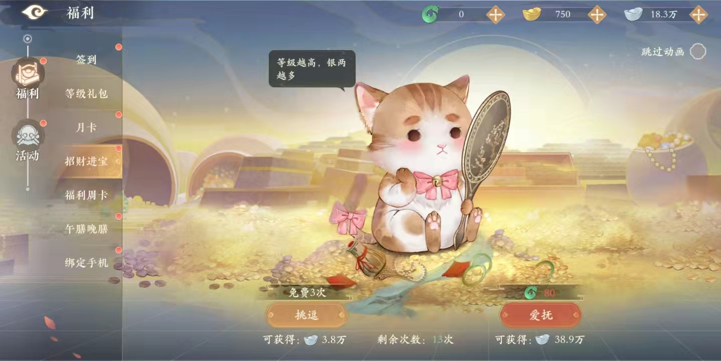 第二種方法是通過招財(cái)進(jìn)寶玩法獲取,玩家可以在游戲主頁面的右上角選擇福利,進(jìn)入之后再選擇招財(cái)進(jìn)寶玩法,這里面會有一只可愛的招財(cái)貓,玩家每日會有三次免費(fèi)挑逗的機(jī)會,挑逗之后可以獲取3.8萬個(gè)銀兩獎(jiǎng)勵(lì),三次機(jī)會用完之后,再想要挑逗貓咪就需要花費(fèi)元寶購買次數(shù)了。