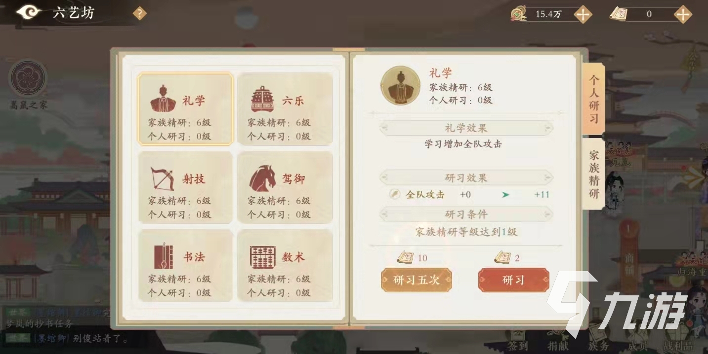 六藝坊:六藝坊講的是君子六藝。玩家可通過(guò)研習(xí)六藝來(lái)提升個(gè)人的屬性,研習(xí)需要用到一定的六一全書(shū)。六一全書(shū)可通過(guò)商店購(gòu)買(mǎi),也可通過(guò)做任務(wù)獲取。