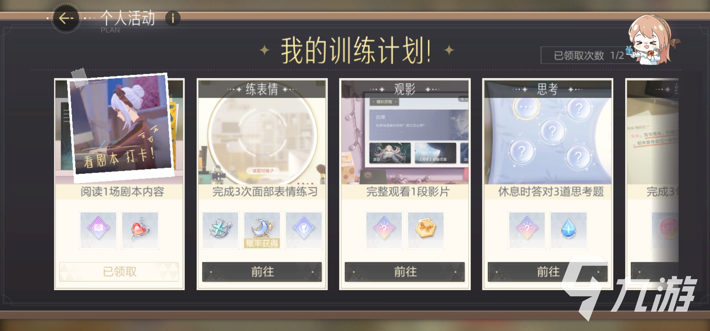 個人活動從主界面左下角“home(家)”入口進入,在我們溫馨的小家了,除了個人活動外,還有成就、外觀裝扮、人脈、約會、事件簿等非常貼近現(xiàn)實個人生活的玩法,個人活動玩法則是從左下角或者點擊屏幕里主角的形象進入。在個人活動里,我們可以看自身的喜歡選擇個人活動,每天只有一次機會可以選擇。如果不知道要怎么選擇個人活動的朋友,那么就參考《我的訓(xùn)練計劃》吧!《我的訓(xùn)練計劃》里,每完成一個計劃會有相應(yīng)的獎勵可以領(lǐng)取,其內(nèi)容均是圍繞“觀影、練表情、鍛煉、看劇本、練臺詞,休息”共六大事件來設(shè)定的,具體的次數(shù)每一輪會發(fā)生變動。接下來為大家總結(jié)如何完成個人活動: