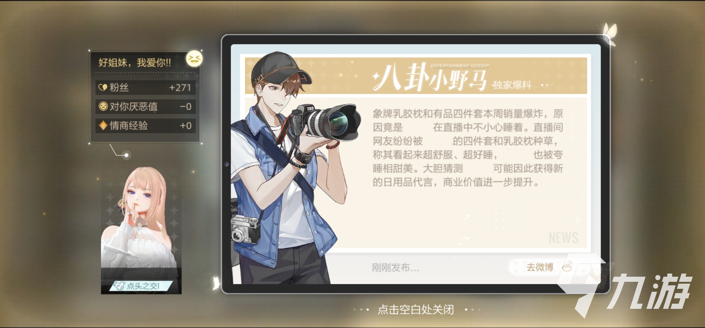 爆料要通過娛樂記者“狗仔小馬”,如果我們能提升和小馬的好感度,能夠獲得專屬的折扣,更多友家(或?qū)遥┑膭?dòng)態(tài)和額外的主動(dòng)聯(lián)絡(luò)機(jī)會(huì),因此多注意和小馬的互動(dòng)哦,送他喜歡的禮物,及時(shí)處理事件。