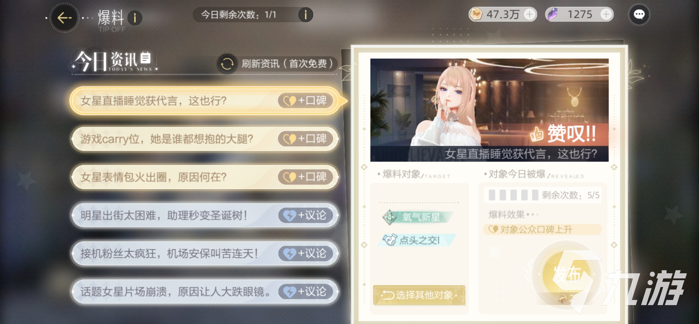 從主界面左下角的“+”號(hào)那里進(jìn)入“爆料”玩法,我們聯(lián)系到資深?yuàn)蕵酚浾?,?duì)自己的好友們使用爆料。爆料玩法的有趣性在于有正面的爆料內(nèi)容,也有負(fù)面的爆料內(nèi)容,會(huì)對(duì)被爆料人產(chǎn)生不一樣的影響。正面的爆料,比如【彩虹屁】是能使得被爆料對(duì)象的公眾口碑上升,是增加好處的,負(fù)面的爆料,比如【傳聞】是被爆料對(duì)象的公眾議論增加,這樣就使得被爆料人要抽精力去處理這件事,不知道是什么塑料姐妹花的情誼,讓玩家產(chǎn)生了爆料負(fù)面新聞的想法,這也就是樂趣所在。