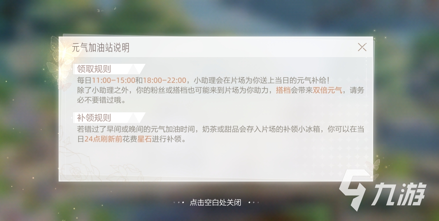 加油站并不是隨時都能為玩家補(bǔ)充元?dú)獾?,它是有一個領(lǐng)取的時間限制,每天有兩次領(lǐng)取的機(jī)會,第一次在11:00-15:00之間,第二次在18:00-22:00之間,在領(lǐng)取時間范圍內(nèi),玩家隨時都可以補(bǔ)充當(dāng)日的元?dú)?,另外,如果玩家粉絲比較多的話,還會觸發(fā)粉絲助力,這個時候玩家就能領(lǐng)取雙倍的元?dú)獾?,也就?0點(diǎn)元?dú)狻?/p>