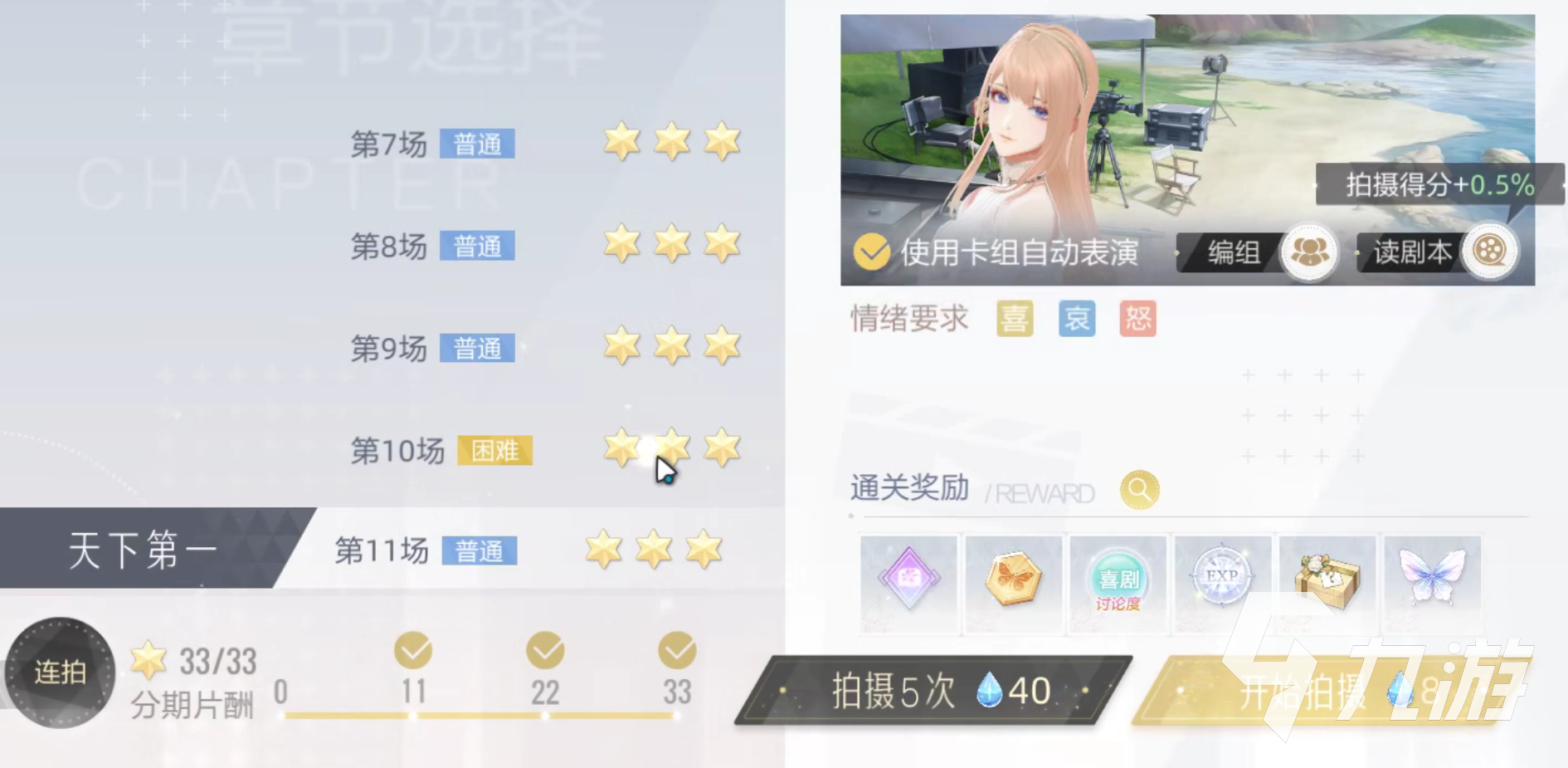 游戲中的劇本拍攝玩法相當(dāng)于副本闖關(guān)模式,玩家們想要推動(dòng)后續(xù)的發(fā)展,劇本拍攝就一定要及時(shí)跟進(jìn)。否則很多人物和功能無法順利解鎖,可玩性也會(huì)降低不少。在劇本拍攝的過程中,玩家們可以獲得大量的經(jīng)驗(yàn)加成。