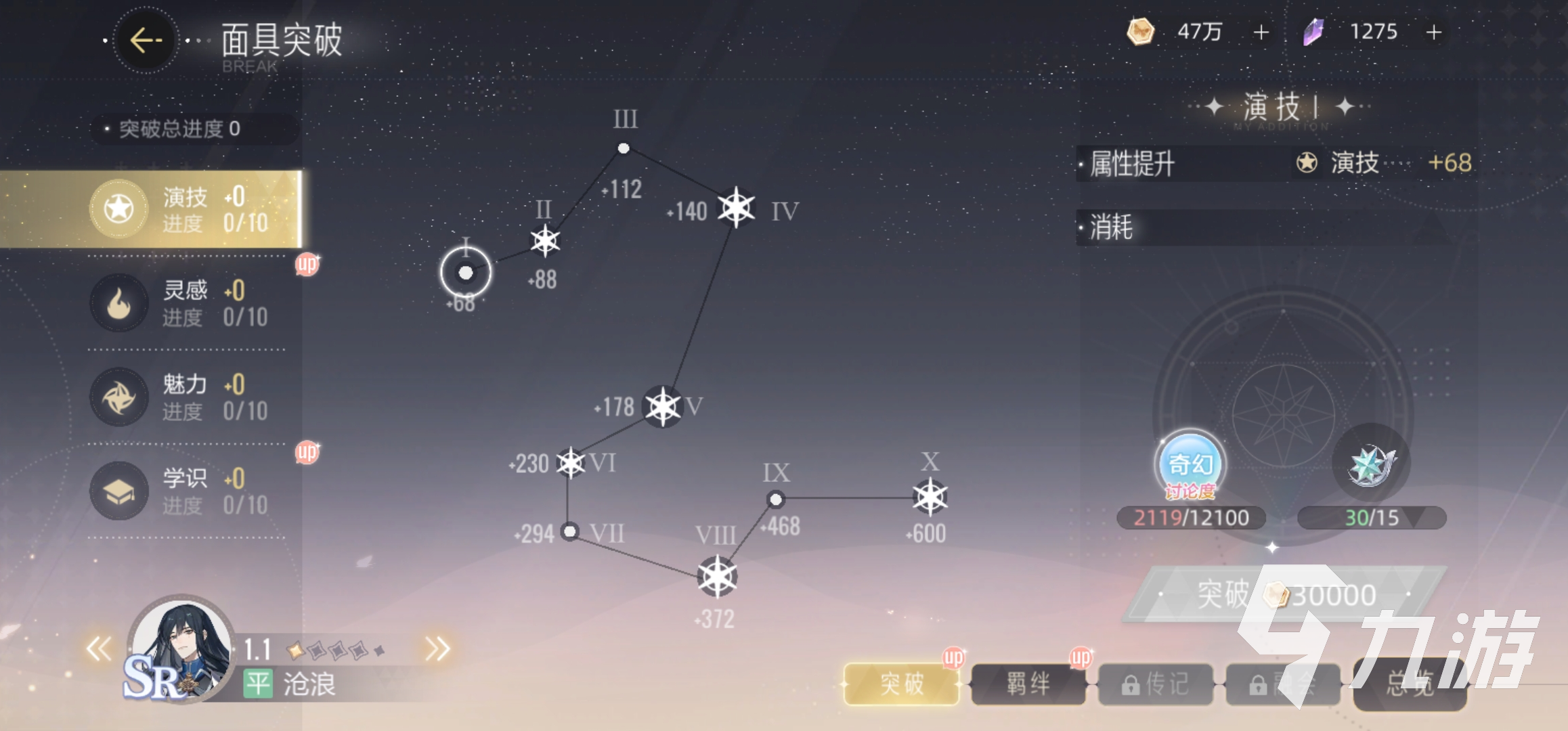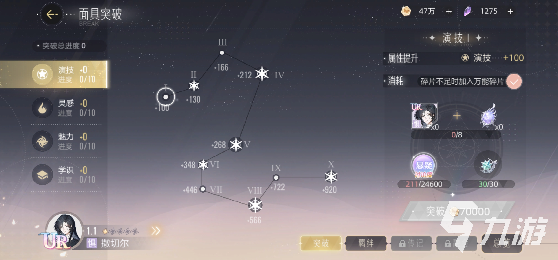 絕對(duì)演繹將面具分為四種等級(jí)(稀有度):UR、SSR、SR、R四種,每種等級(jí)都是不一樣的突破材料,按從難到簡(jiǎn)單排序。UR需要的是是8個(gè)該UR面具的碎片或萬(wàn)能碎片,以及24600點(diǎn)的討論度和30顆星影紋章。;SSR需要8個(gè)該SSR面具的碎片,以及17200點(diǎn)的討論度和21顆星影紋章;SR需要12100點(diǎn)的討論度及15顆星影紋章,R只需要8500點(diǎn)的討論度及11顆星影紋章,綜合分析下來(lái),共同需要消耗的原材料就是【討論度】和【星影紋章】了。