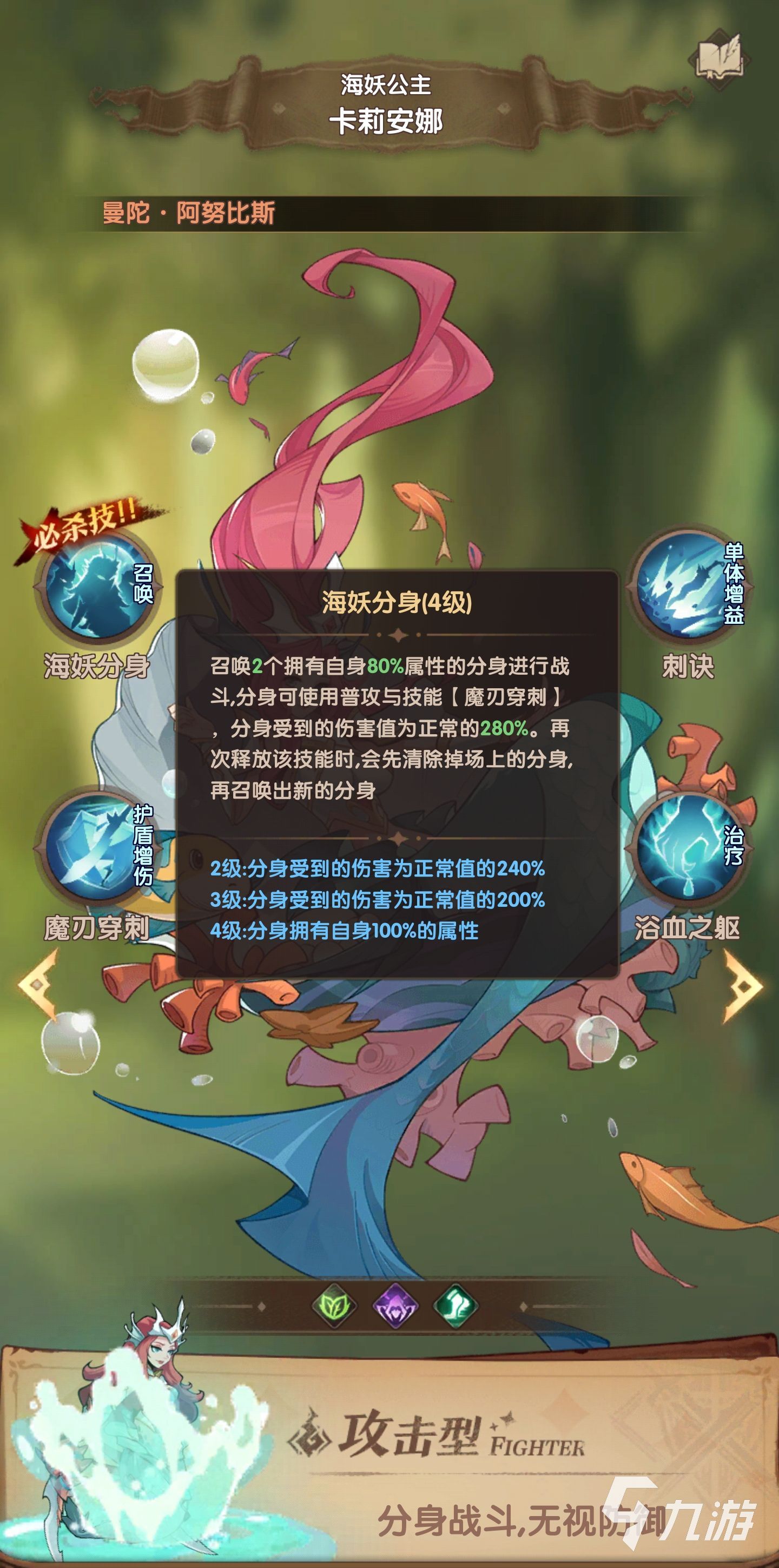卡莉安娜是一名攻擊性的角色,比較擅長在游戲中召喚出來分身進行戰(zhàn)斗,并且不論是技能傷害還是普攻傷害,她都無視敵方的防御能力。首先要說一下她的必殺技能,海妖分身,這個技能可以召喚兩個擁有自身屬性的分身進行戰(zhàn)斗,如果自身使用技能攻擊的話,分身也會模仿本體,如果再次釋放召喚必殺技能的時候,就會清除場上的分身,并不會存在于多于兩個的分身,但是也是十分變態(tài)的,升級到四級之后,分身就相當于擁有著卡莉安娜100%的屬性,敵方如果沒有群體傷害的英雄,就只能等著哭了。