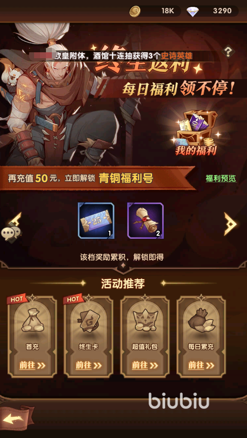 2、每日獎勵可領取50元福利券,普通招募券3個。