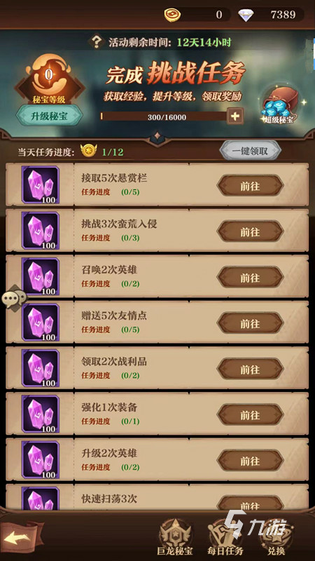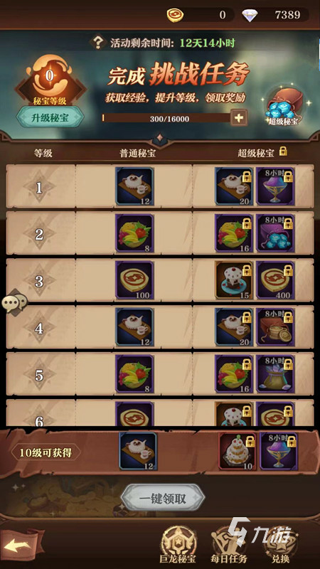 玩家進(jìn)入游戲后,可以在主頁(yè)面中看到巨龍寶藏活動(dòng),此活動(dòng)的活動(dòng)周期持續(xù)為15天,在活動(dòng)周期內(nèi),玩家可以通過對(duì)應(yīng)的戰(zhàn)令任務(wù)來獲取戰(zhàn)令經(jīng)驗(yàn),通過戰(zhàn)令經(jīng)驗(yàn)提升戰(zhàn)令等級(jí),解鎖獎(jiǎng)勵(lì)。在秘寶中包括普通秘寶和超級(jí)秘寶兩種。通過完成相應(yīng)的每日任務(wù)可以進(jìn)行兌換戰(zhàn)令經(jīng)驗(yàn).