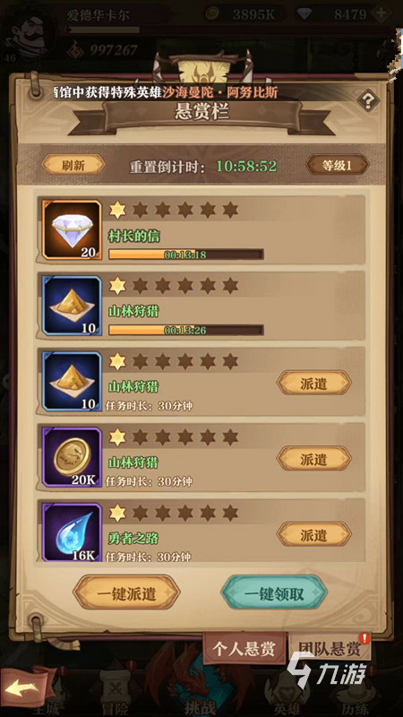 團(tuán)隊(duì)?wèi)屹p任務(wù),每天定時(shí)增加一個(gè),每個(gè)團(tuán)隊(duì)?wèi)屹p任務(wù)可以保留7天,玩家選擇相應(yīng)的任務(wù)派遣符合條件的英雄當(dāng)?shù)竭_(dá)時(shí)間后,即可獲得多種不同的道具獎(jiǎng)勵(lì)。比如完成村長的信任務(wù)后,可以獲得20顆鉆石,完成山林狩獵任務(wù)后,可以獲得英雄粉塵道具獎(jiǎng)勵(lì)。