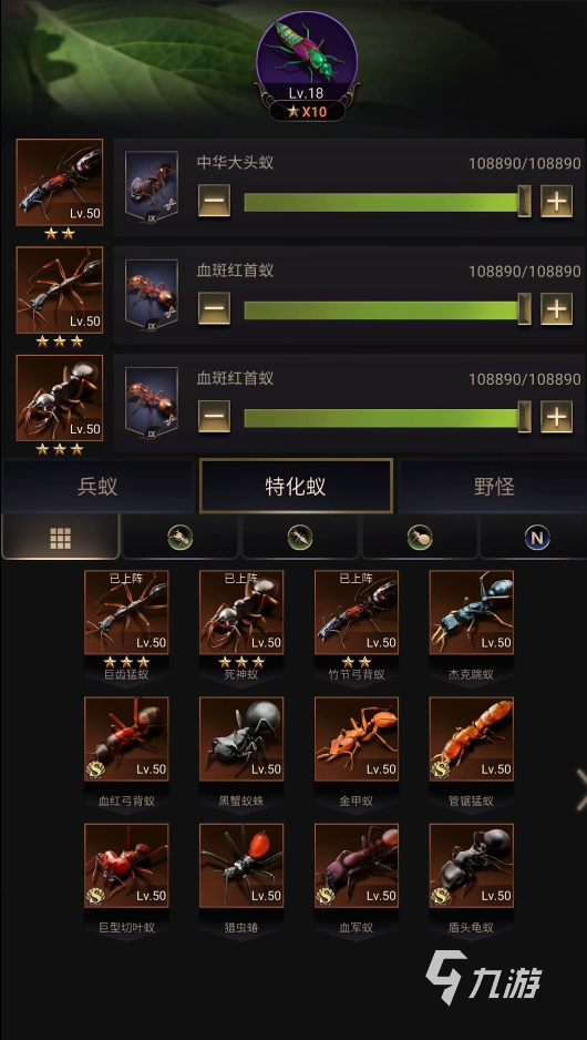 第二種方法便是上場特化蟻,游戲中的特化蟻某種程度上來說就是將軍。通過提升持有的對應技能,來增加帶兵的數(shù)量。不過將軍也是有上限的,最多三位,這時候就要考慮如何進行人員的分配。不過要注意的是將軍的使用,不是說一開始就可以上場的,而是要有相應的科技。畢竟是從普通螞蟻中進行特化來的,感覺有點變異的味道了。