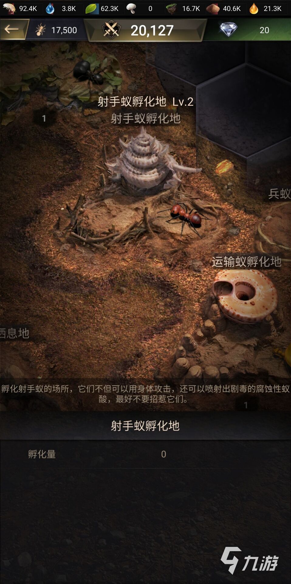射手螞蟻孵化地:在這一個場所,專門來孵化射手螞蟻,射手已在軍隊?wèi)?zhàn)斗中處于后排主要的輸出點,一個軍隊的傷害完全取決于射手螞蟻。