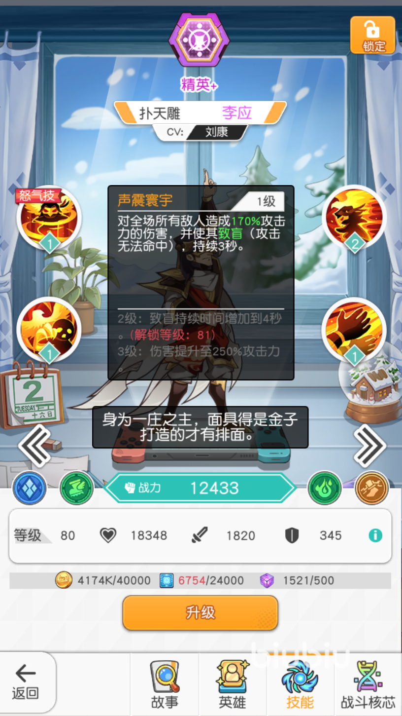 當我們想升級某一個技能的時候可以把這個技能按住就能看到這個技能的介紹了,在技能的介紹中清楚的寫到這個技能會在英雄多少級的時候解鎖,多少級的時候升級。所以小伙伴們要想升級一位英雄的技能就只能去升級這位英雄,英雄的升級非常簡單,只需要每天在掛機獎勵那里領(lǐng)取經(jīng)驗就可以了,領(lǐng)取完經(jīng)驗之后點擊升級按鈕就能升級了,非常簡單。
