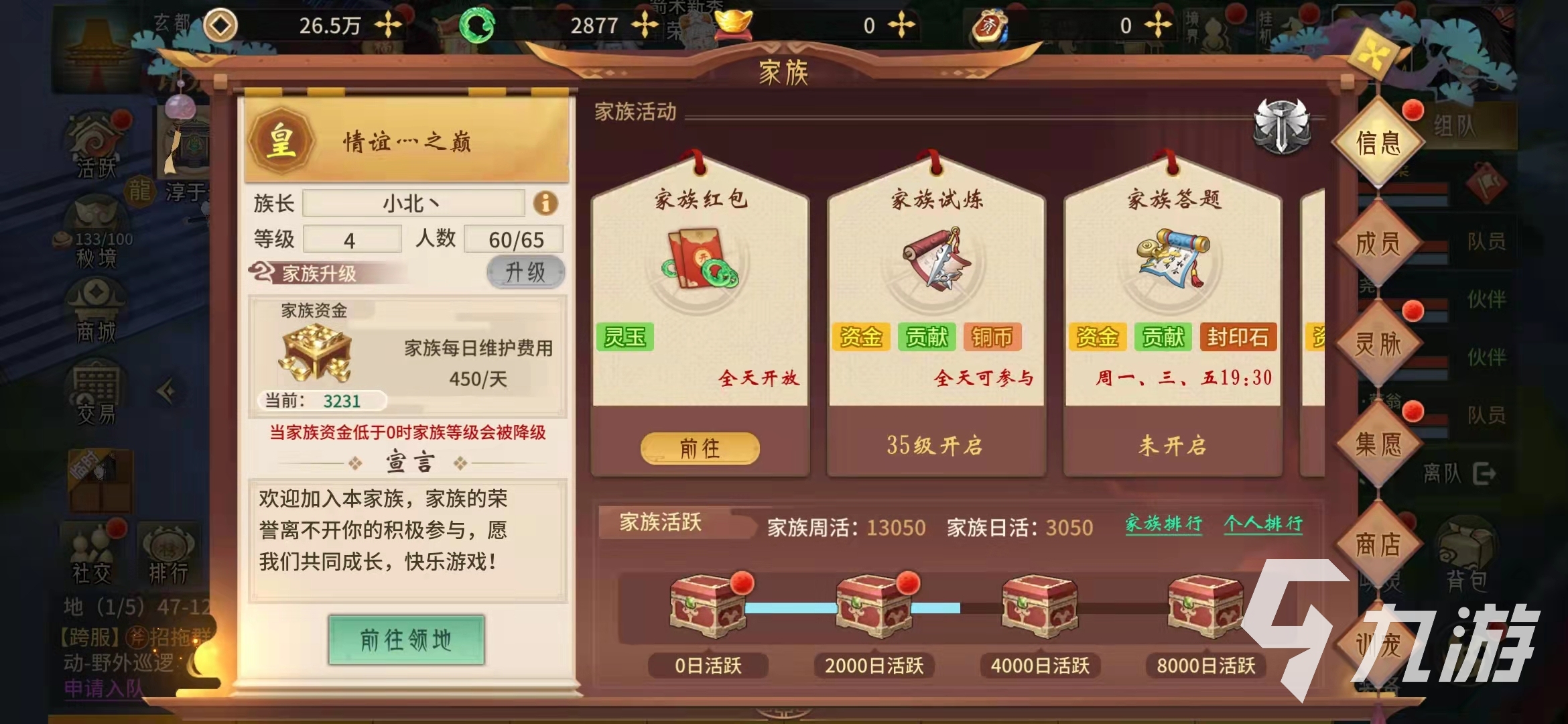 1.玩家在加入家族之后,可以結(jié)交很多小伙伴,并且可以和家族成員組隊(duì)完成野外巡邏、精英試煉等任務(wù),組隊(duì)成員的等級越高做任務(wù)成功的幾率越來,相對獲得的獎(jiǎng)勵(lì)也就越多。